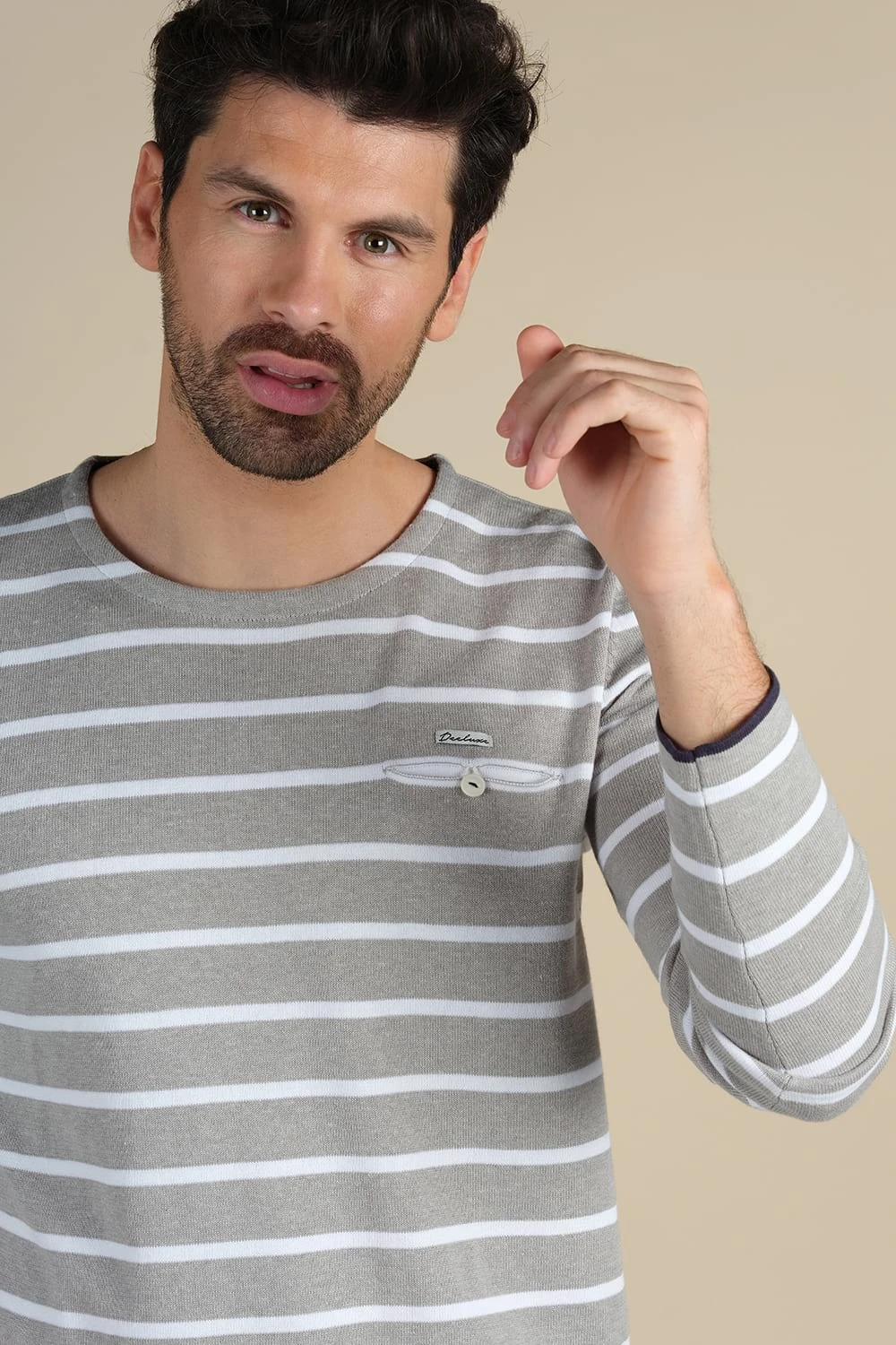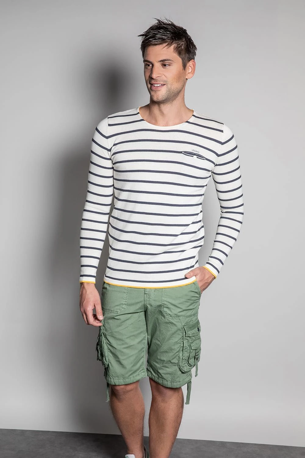 Découvrez notre modèle MADOX, un pull léger à rayures pour homme. Ce pull marinière à col rond en coton avec sa petite poche passepoilée est parfait pour compléter vos tenues.
