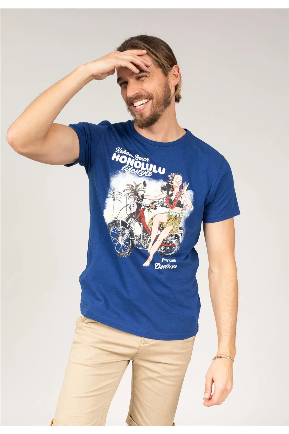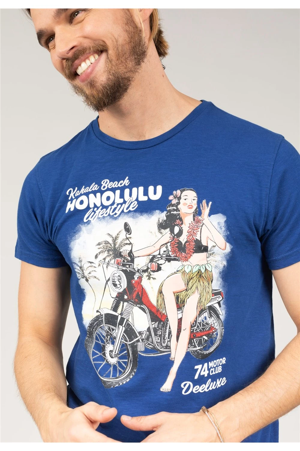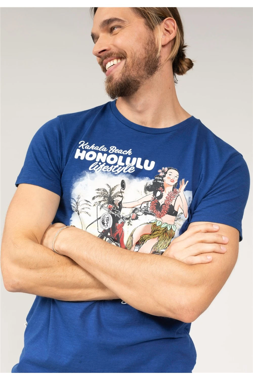 Destination Hawai avec le t-shirt à manches courtes HONOLULU pour homme et son imprimé moto aux airs de vacances. Confectionné en jersey 100% coton.